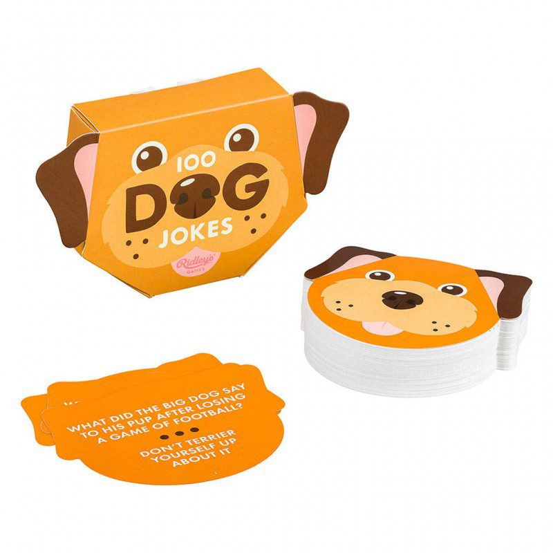 Dog shaped cards with 100 dog themed jokes.