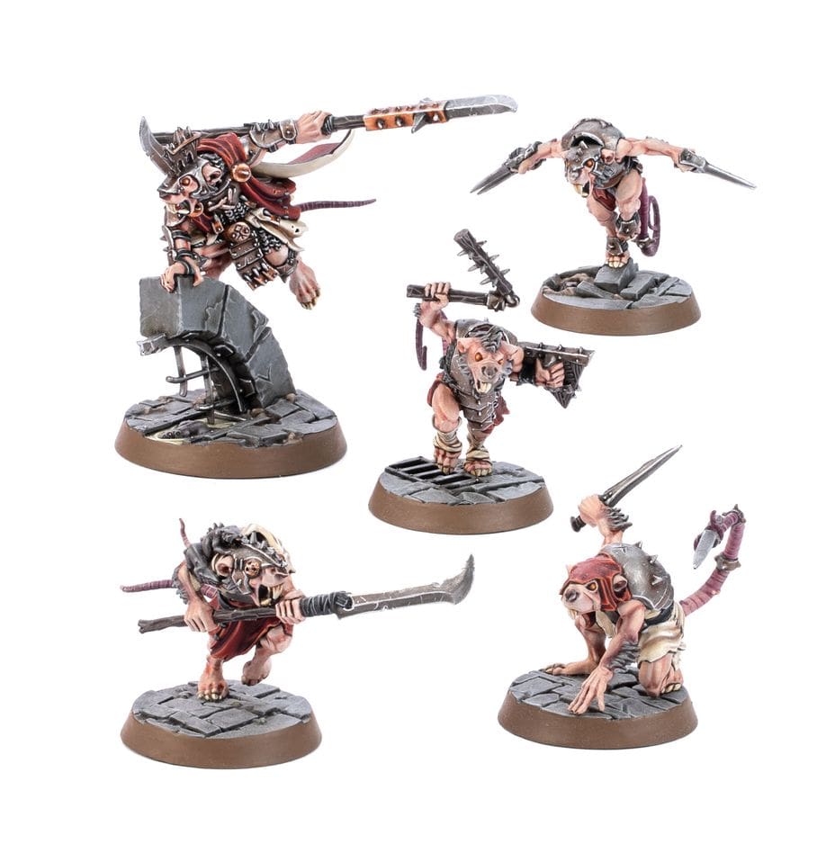 – 1x Spiteclaw’s Swarm warband, consisting of five Skaven fighters cast in rat-like brown plastic