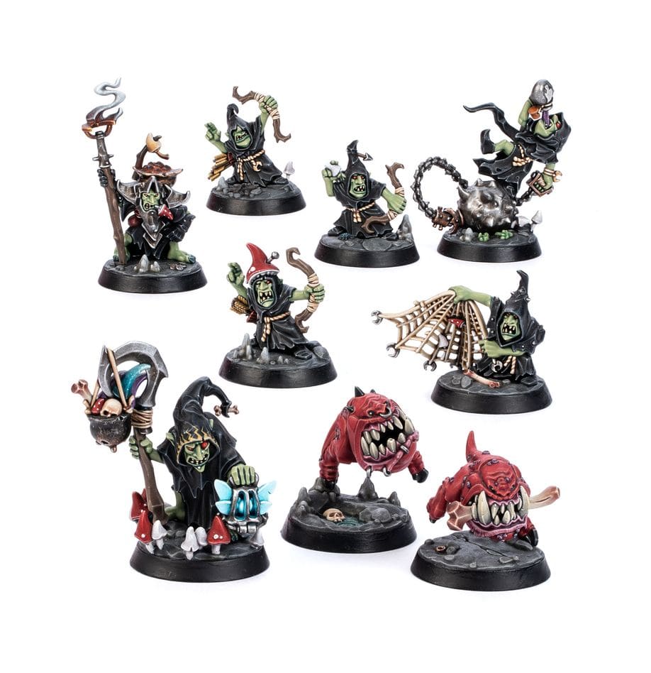 – 1x Zarbag’s Gitz warband, consisting of nine Gloomspite Gitz fighters cast in grot-green plastic
