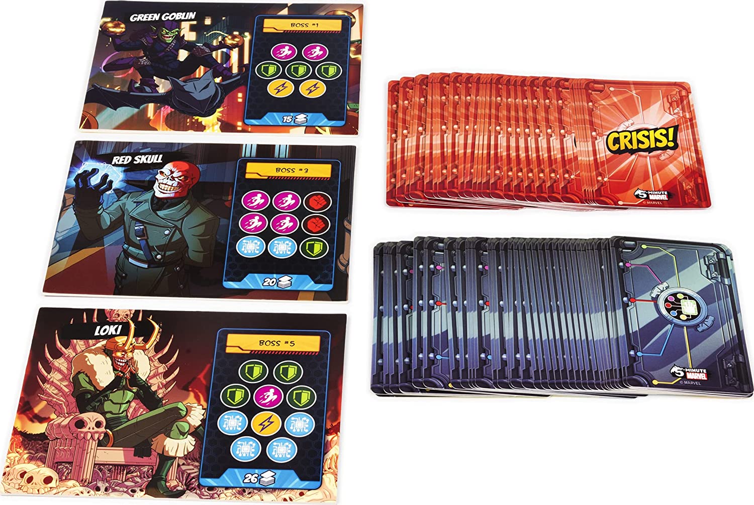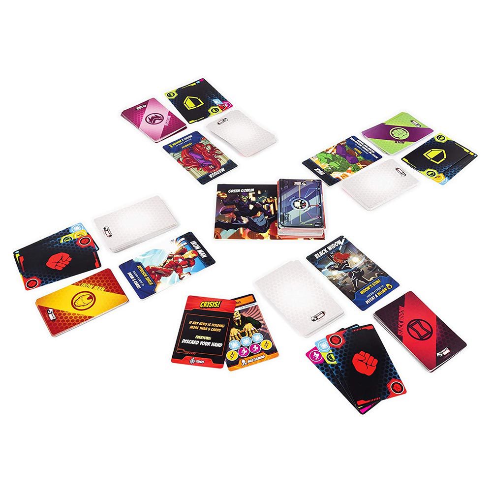 In more detail, players assume the role of one of ten superheroes, each with special cards and abilities. Once the Jarvis-hosted five-minute timer starts, the race is on to defeat all the villains in the mission. In order to defeat a villain, players must match symbols from their hand with ones on the villain’s card. At the end of each mission is a powerful super villain — and after the first super villain is defeated, the campaign continues to the second super villain. Each super villain, and each randomized mission, gets harder until players reach Thanos, the final super villain.