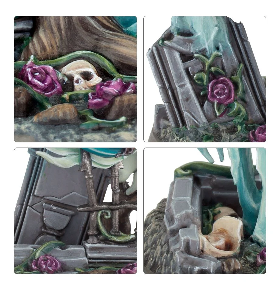 This kit comes as 16 components, and is supplied with 4 32mm sculpted round bases – these depict a sepulchral scene, with bones, broken statues and roses littering the graveyard the Banshees drift above.