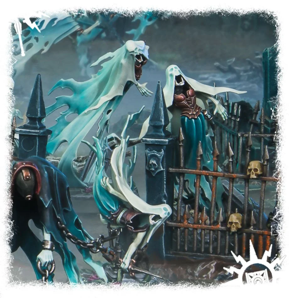 The Myrmourn banshees have a diabolical hunger, for they feast solely upon magic. No enemy spell is safe from the ravenous spirits, and they haunt the Mortal Realms in search of arcane energies to consume. Myrmourn Banshees are drawn to magic as carrion are drawn to the dead, and such is their bitterness toward life that any mortal creature in their way is likely to receive a swift jab from their cursed chill daggers.