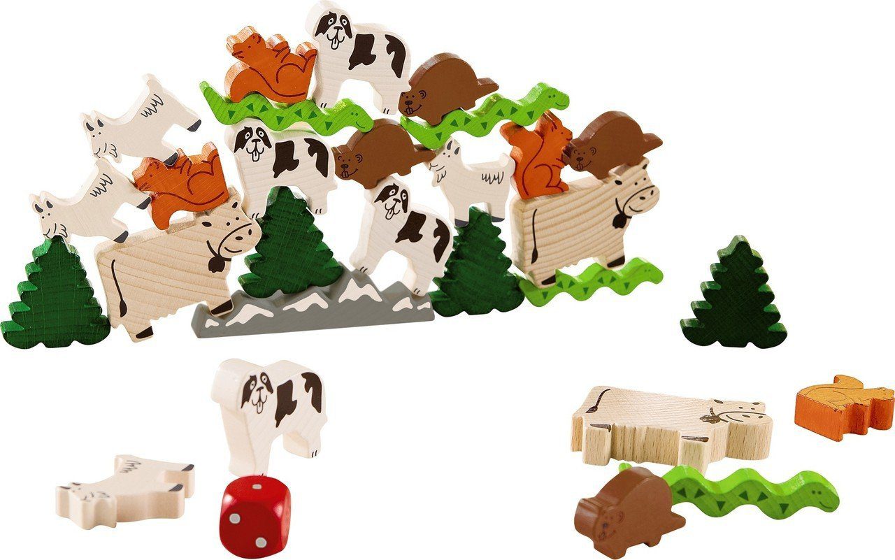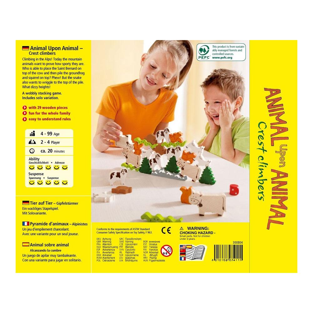 Animal Upon Animal: Crest Climbers uses the same basic gameplay as Animal Upon Animal: Each turn a player rolls the die and either places one or two animals on to the stack of animals, passes one of their animals to another player for them to place, or places an animal on the table, extending the base for other players to build upon. Of course, if any pieces fall off whilst you are building, you get up to two of them back. The first player to have used all of their animals wins