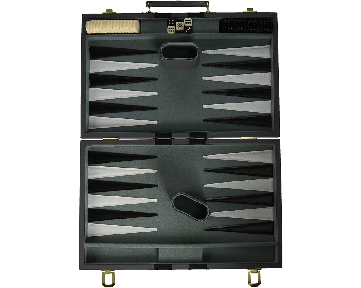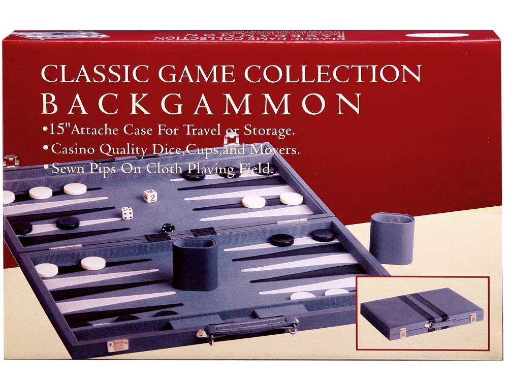 15″ Attache case for travel and storage; includes casino quality dice, cups and movers. Features sewn pips on cloth playing field.