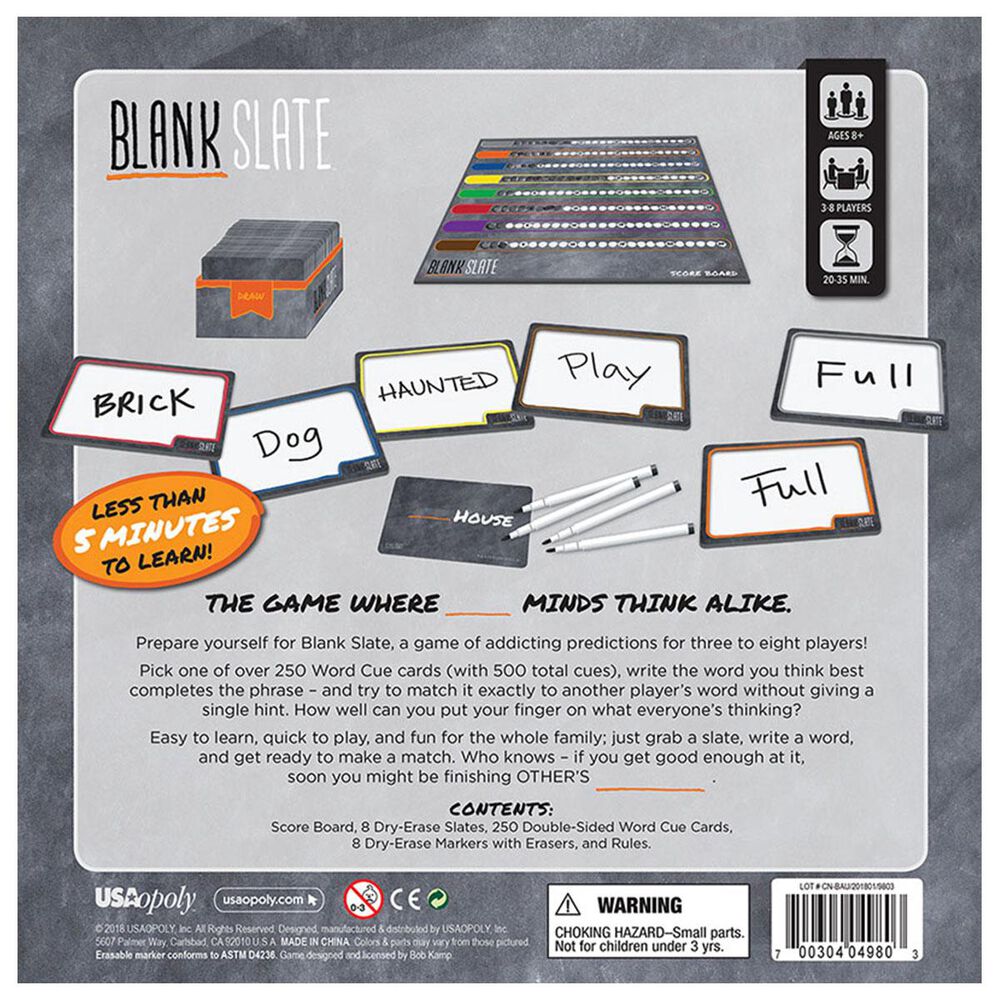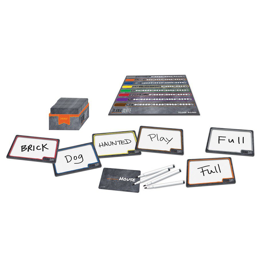 Each round in Blank Slate, pick one of the 250+ word cue cards (which have 500+ total cues) and reveal it. Each player then writes the word they think best completes the phrase, trying to exactly match another player’s word without giving a single hint.