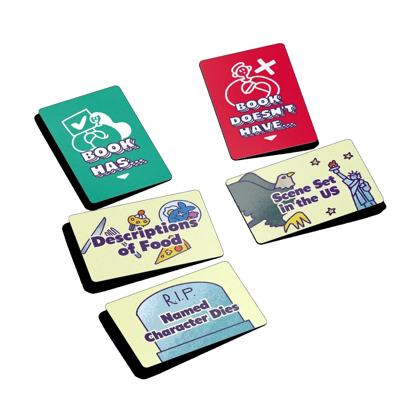 At the start of each round, draw a card for the “Book has…” column—for example, “Pet.” Once the group names a book that matches the description, draw the next description card. If it applies to the book you just named, add it to the “Book doesn’t have…” column.