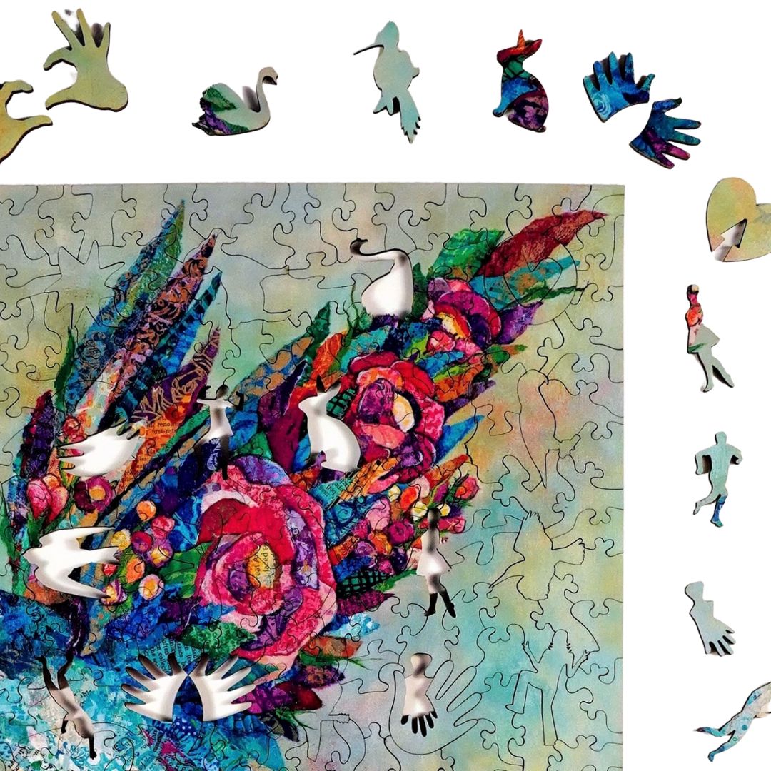 This is the largest of all the puzzles that we have created and the whimsy pieces of delicate hands, body movements and various flight birds will amaze you. The image on this puzzle is original artwork by Lisa Morales.