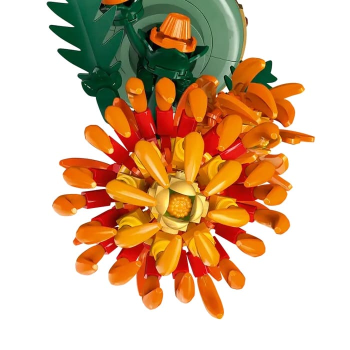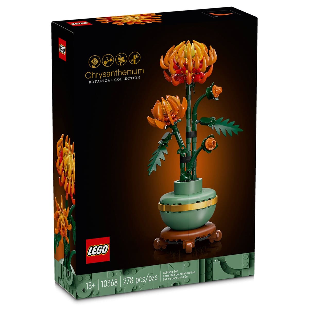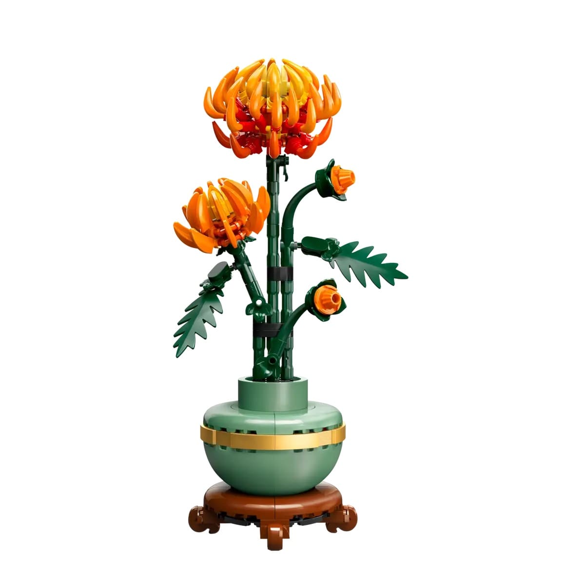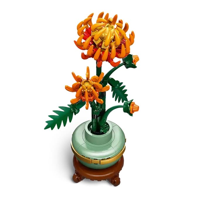 - Blooming buds – The LEGO® Icons Chrysanthemum with posable leaves and petals captures the vivid orange flower in various stages, including 1 in full bloom, 1 blossoming and 2 in bud