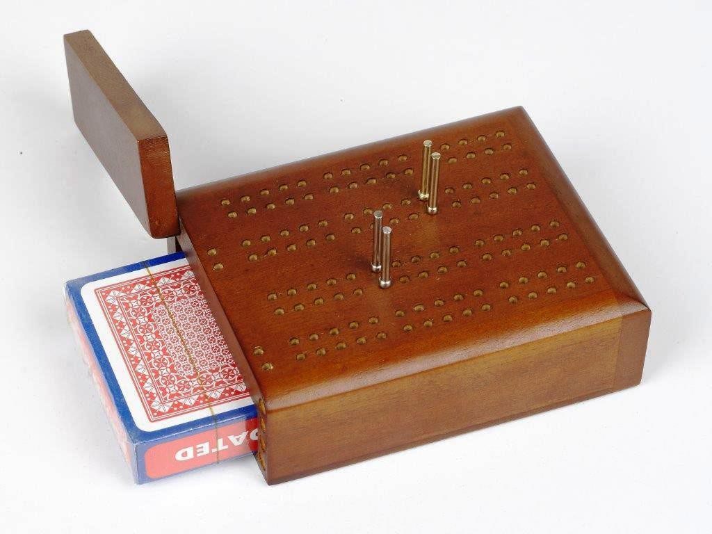 2 Player Wooden Cribbage board with internal storage and a pack of playing cards.