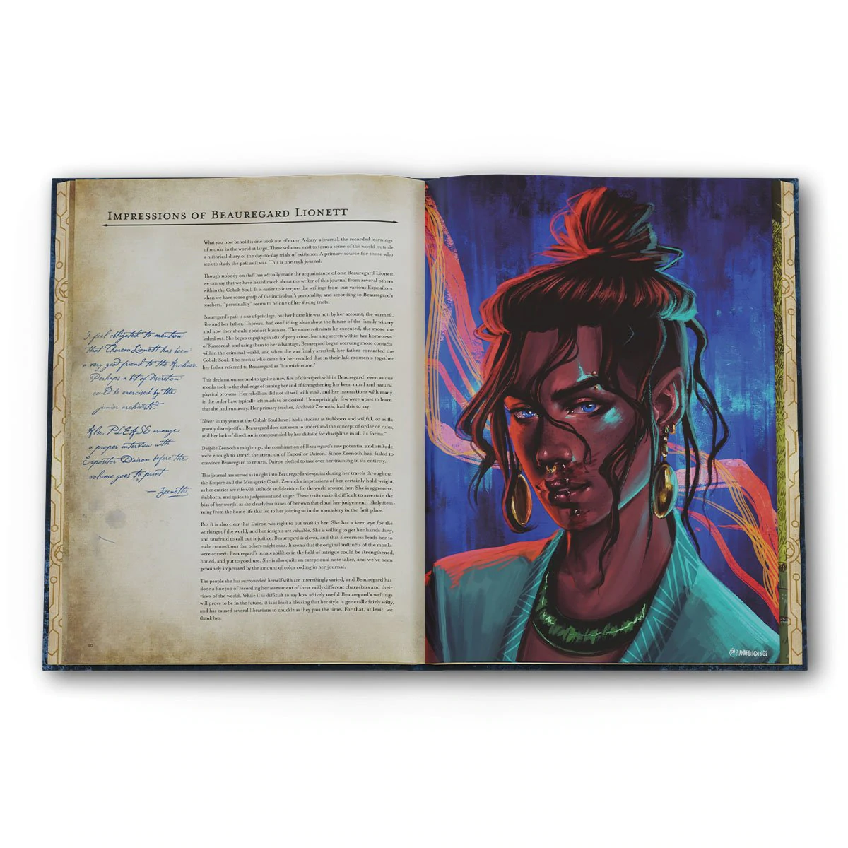 Encompassing the first chapters of our second campaign, this tome illustrates the adventures of our unlikely heroes as they meet in Trostenwald, struggle through a heartbreaking encounter with the Iron Shepherds, and more. Featuring stunning works by artists from the Critter community, The Chronicles of Exandria — The Mighty Nein is a beautiful way to revisit the origin of the Mighty Nein through the perspective of expositor Beauregard Lionett and the archivists of the Cobalt Soul.