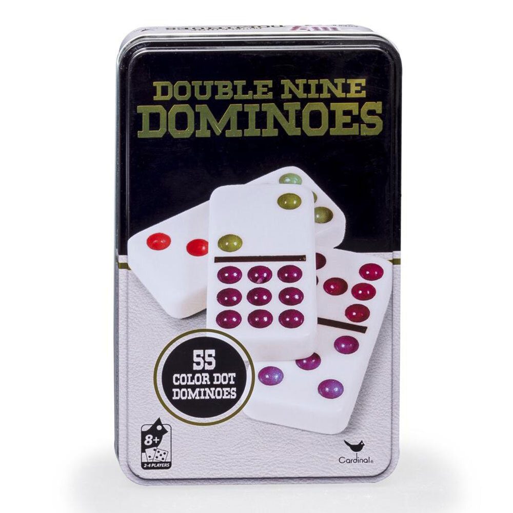 This set includes 55 durable, ivory-colored, plastic dominoes that stack neatly in a convenient storage tin.