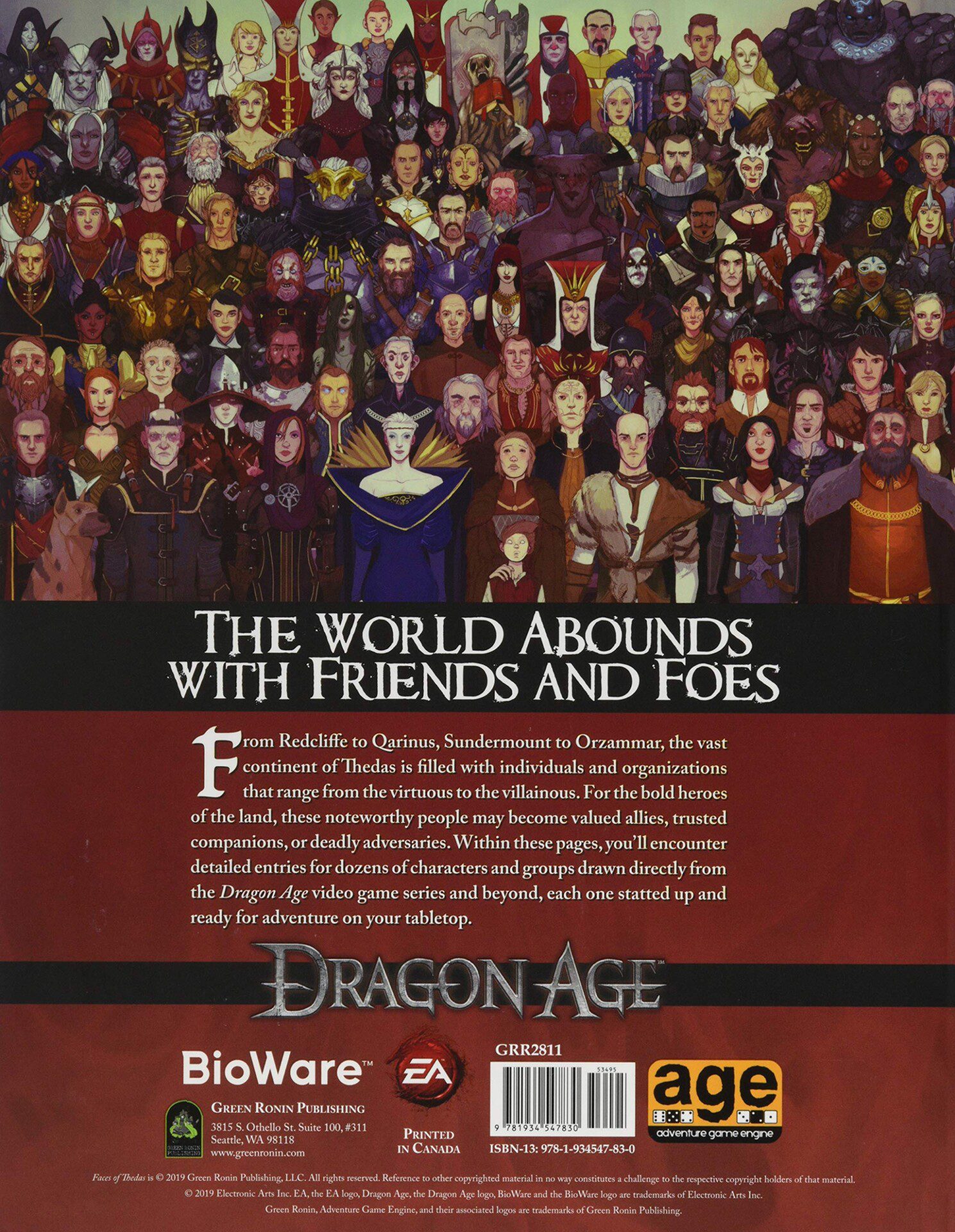 Faces of Thedas lets you bring a host of compelling characters from the Dragon Age video games and beyond to your game table. From fan-favorite companions like Alistair and Dorian to deadly antagonists like Loghain and Knight-Commander Meredith, this book gives Game Masters a memorable cast to work with, providing game statistics, backgrounds, and advice on how best to use these characters in your own Dragon Age campaigns. It also includes new rules for managing and using relationships in play, giving additional depth to rivalries, friendships, and romance. Major organizations like the Antivan Crows and the Carta are also detailed. Faces of Thedas is a must for any Dragon Age GM.