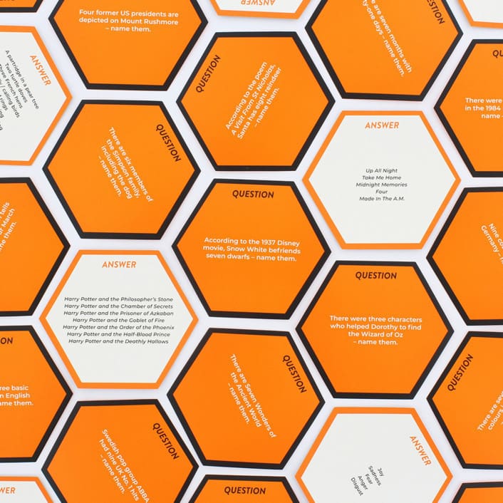 Includes 80 hexagon-shaped trivia cards.