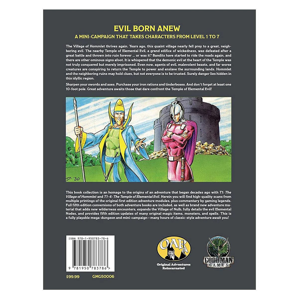 The Village of Hommlet, a quaint village that once nearly fell prey to a great, neighboring evil some years ago, thrives again. The nearby Temple of Elemental Evil, a grand edifice of wickedness, was defeated after a great battle and thrown into ruin forever … or was it? Bandits have started to ride the roads again, and there are other ominous signs afoot. It is whispered that the demonic evil at the heart of the Temple was not truly conquered but merely imprisoned, and even now agents of evil, malevolent beasts, and far worse creatures are conspiring to return the Temple to power and enslave the surrounding lands. Hommlet and the neighboring ruins may hold clues, but not everyone is to be trusted, and surely danger lies hidden in this idyllic region.