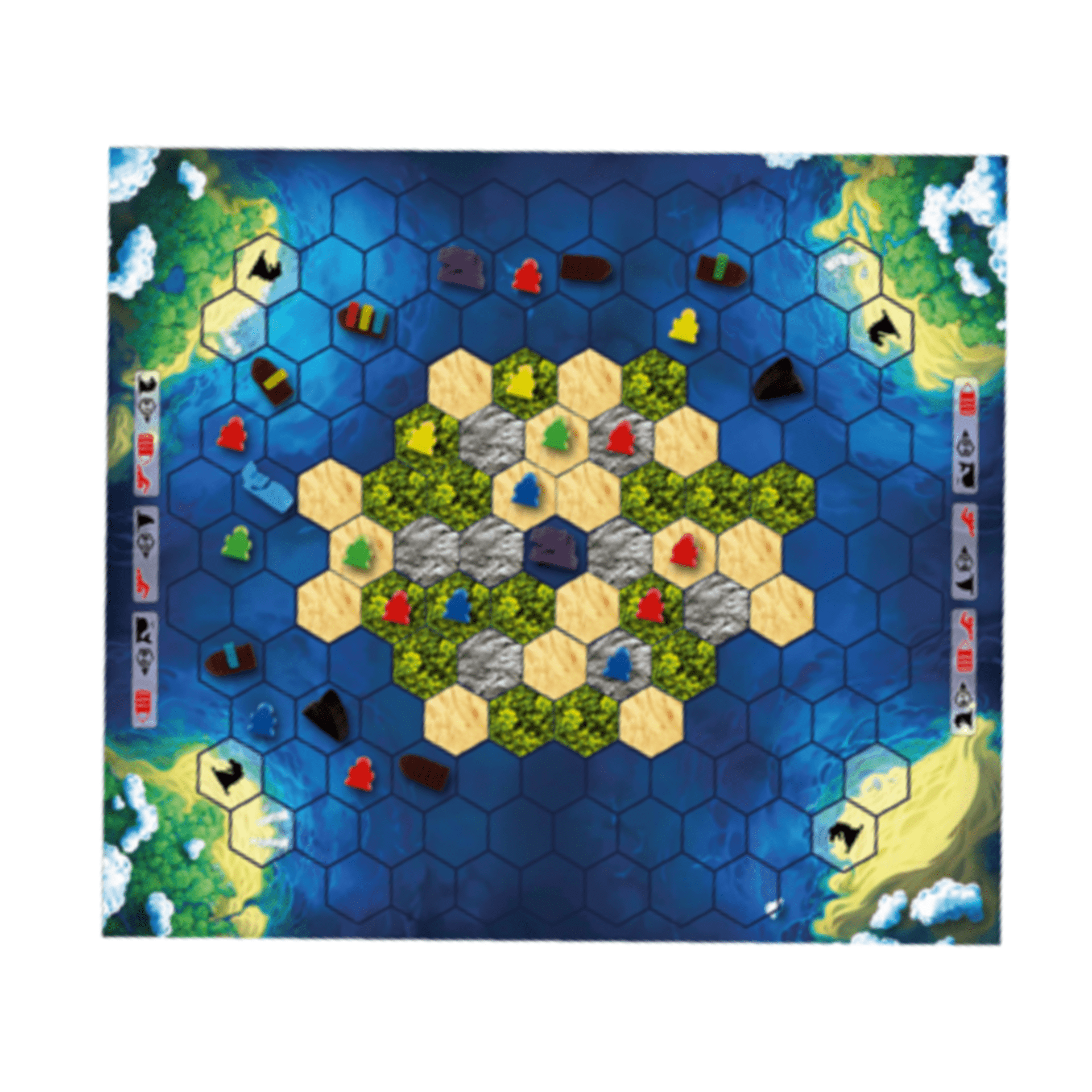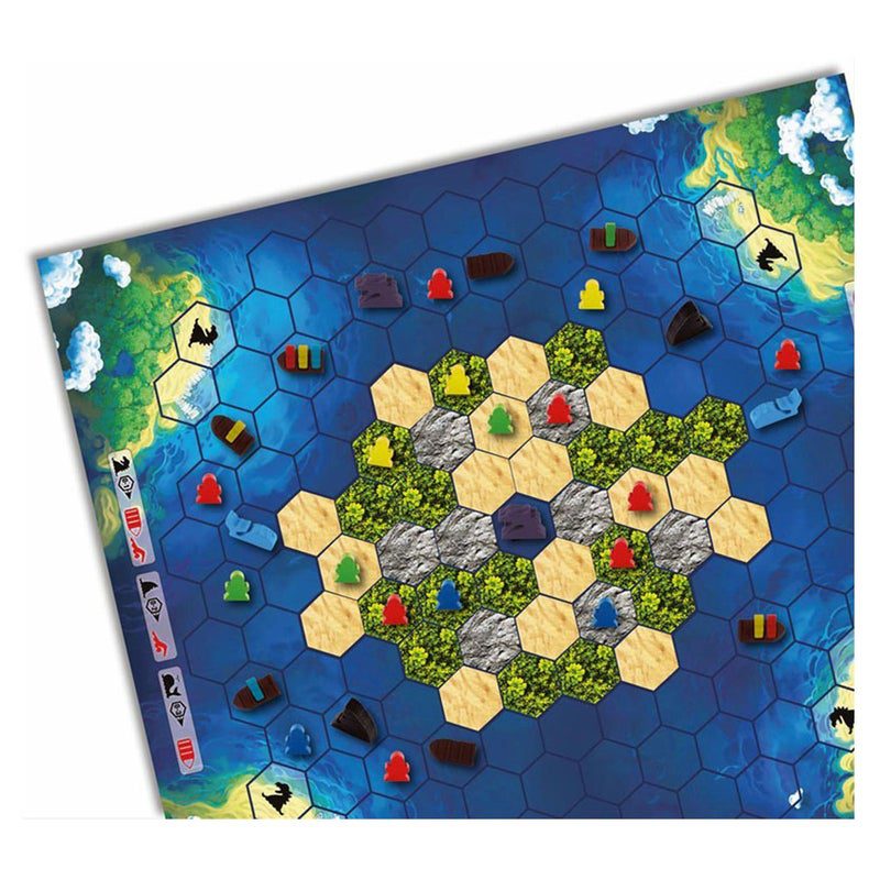 An island made up of 40 hex-tiles is slowly sinking into the ocean (as the tiles are removed from the board). Each player controls ten people (valued from 1 to 6) that they try and move towards the safety of the surrounding islands before the main island finally blows up. Players can either swim or use boats to travel but must avoid sea serpents, whales and sharks on their way to safety.