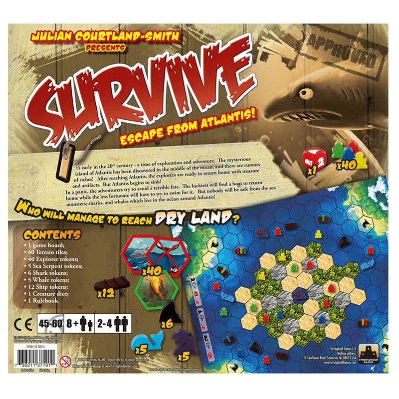 Survive was reprinted as “Survive: Escape from Atlantis!” by publisher Stronghold Games and hit store shelves in February, 2011. The reprint contains the game Survive, as well as all the extra pieces needed in order to play the game as “Escape from Atlantis” and is actually found here: Survive: Escape from Atlantis! because it came with the dolphins and dive dice which were removed from the anniversary edition which was released a couple of years later (though they were later made available by themselves for owners of that version).