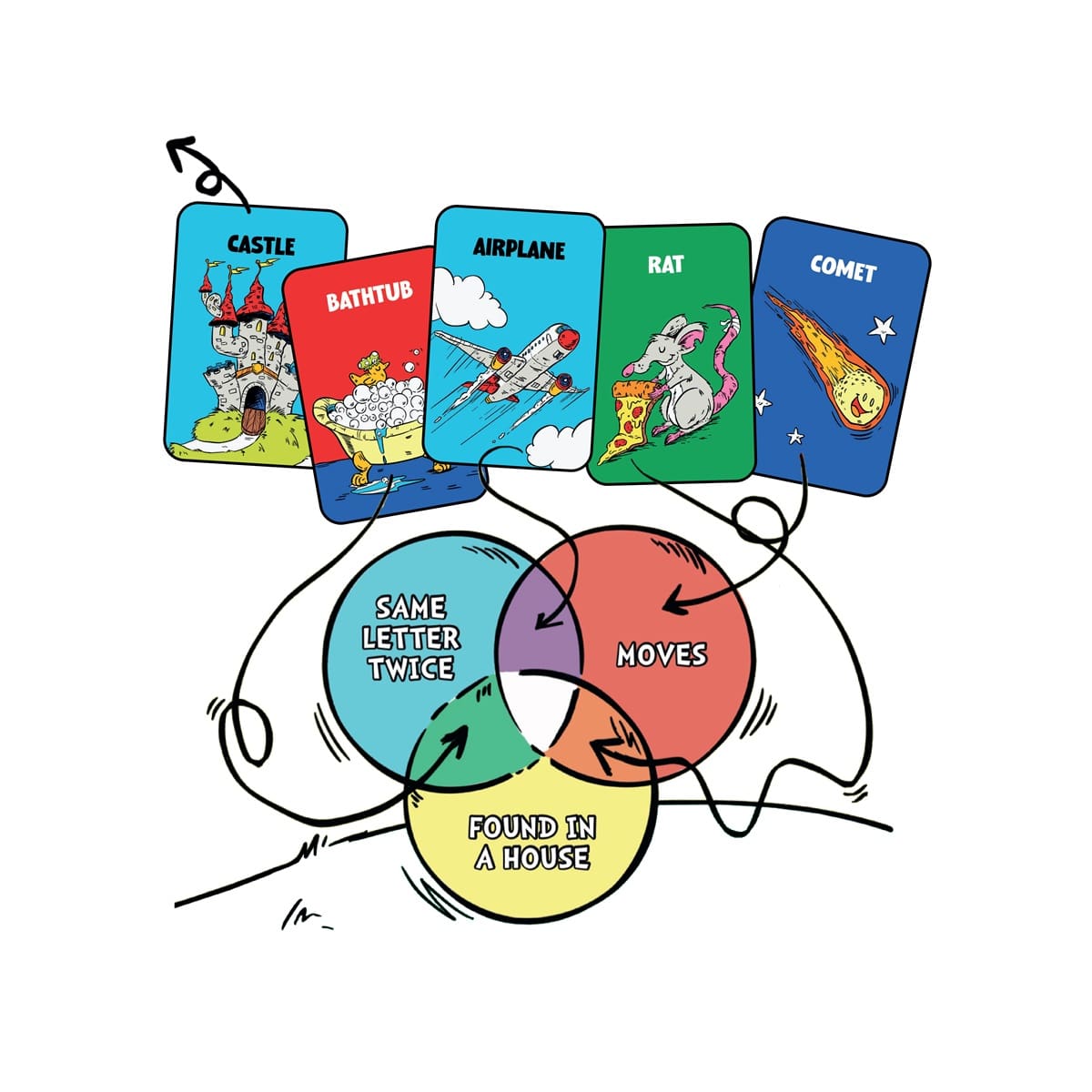 - Play and Learn: On your turn, place an object card into the diagram. If it fits, continue your turn by placing another card. If it doesn’t fit, “The Knower” helps reposition it correctly.