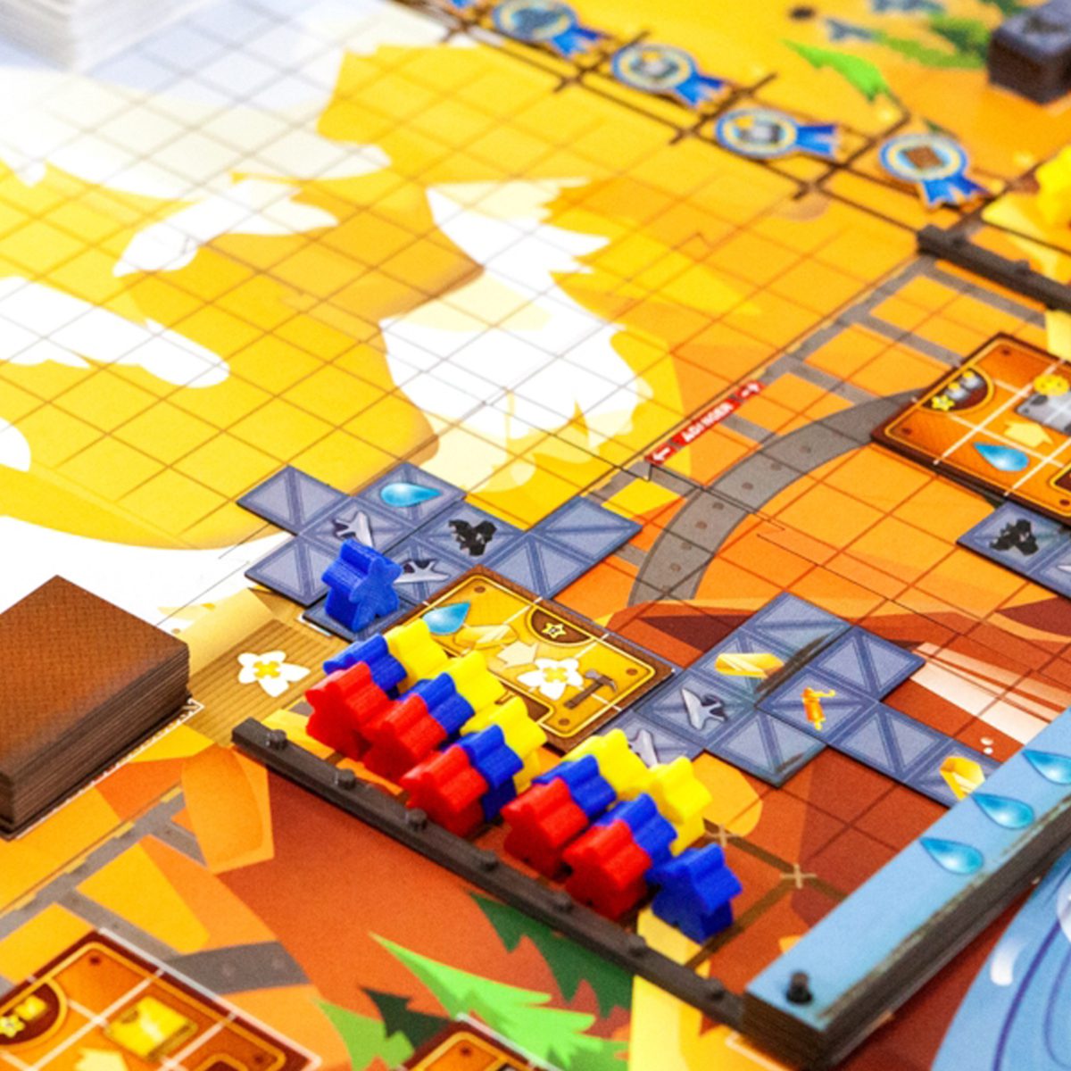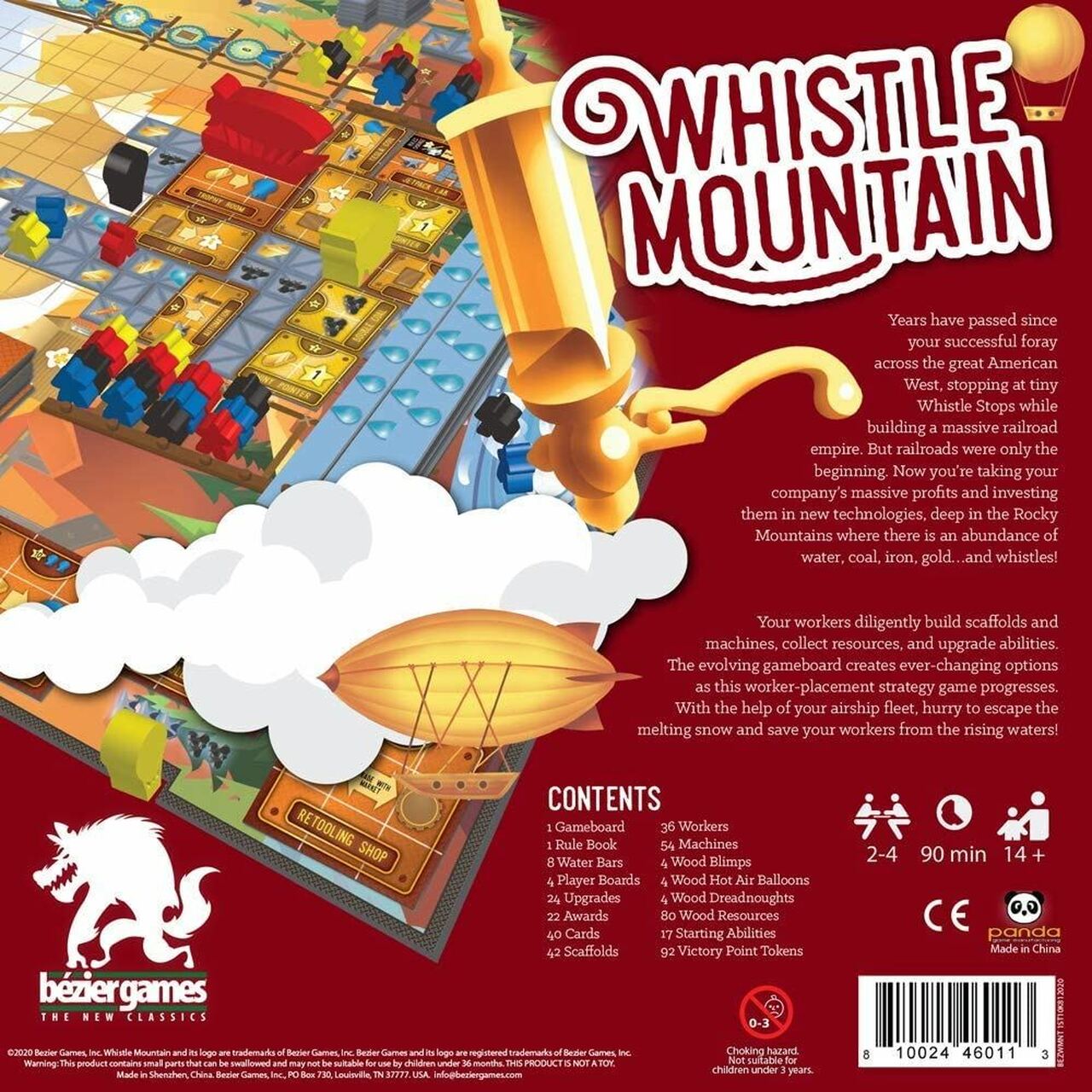 Welcome to Whistle Mountain! Collect resources with the assistance of blimps, dreadnoughts, and hot air balloons as you make your way up the mountainside. Spend those hard earned resources on scaffolds, machines, and equipment to rise higher than the competition as the water levels from the melting snow caps rise beneath you! Most importantly, you will need to protect your workers from the ever threatening floodwaters by moving them to safety on the newly constructed scaffolding.