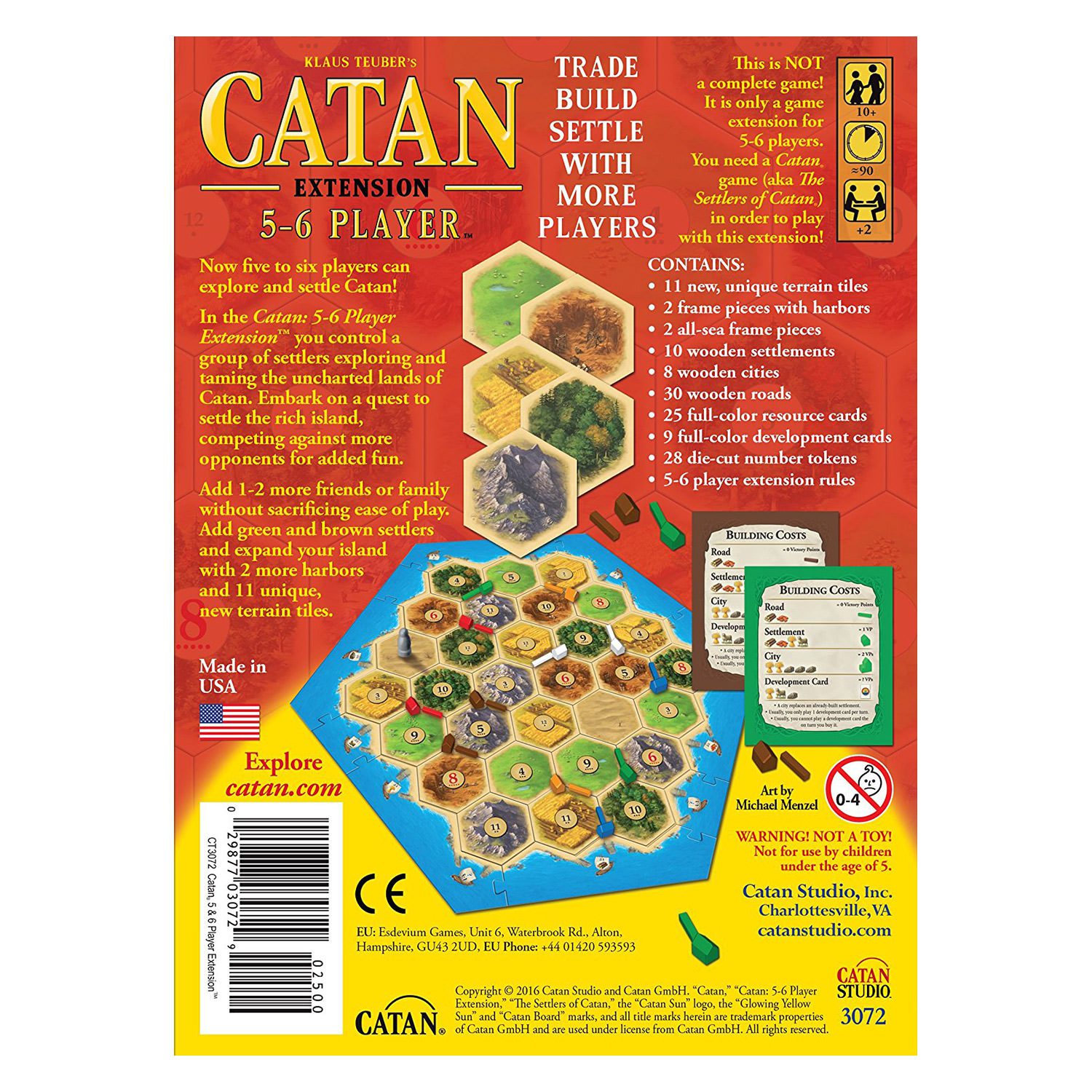 Ever wish you could add more players to your game of Catan? The New Catan 5-6 Player Extension Pack allows you to extend your Catan® game to include more players and more scenarios! This extension pack includes additional tiles, more resource cards, more development cards, and components (settlements, villages, roads) for adding an two additional players to your Catan game.