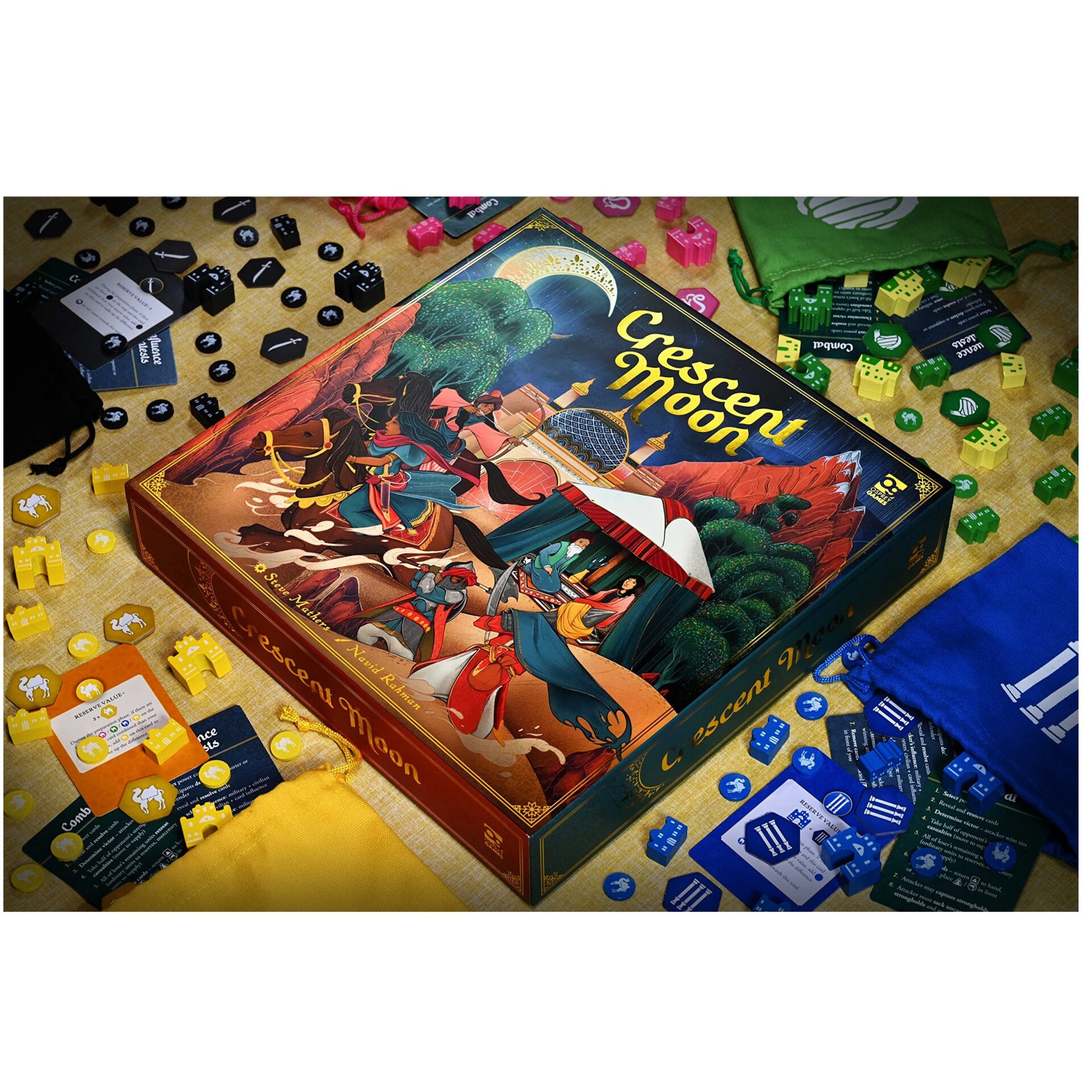 Crescent Moon is played over three years (or four years in the long game). Each year, players will take four actions which might be to deploy new armies, enlist mercenaries, build fortifications and settlements, conquer new land, expand their influence, and much more. Each character has a unique pool of abilities and available actions, which will shape their game, whether its the Sultan, who cannot raise their own army and must depend on mercenaries, or the Murshid, who can use their political influence to interfere in other characters’ battles. Players can purchase potent power cards, representing ploys, wise advisors, and specialist units from a market shared between all players. At the end of each year, players score points according to their own unique character objectives, and at the end of the game, the player with most points wins.
