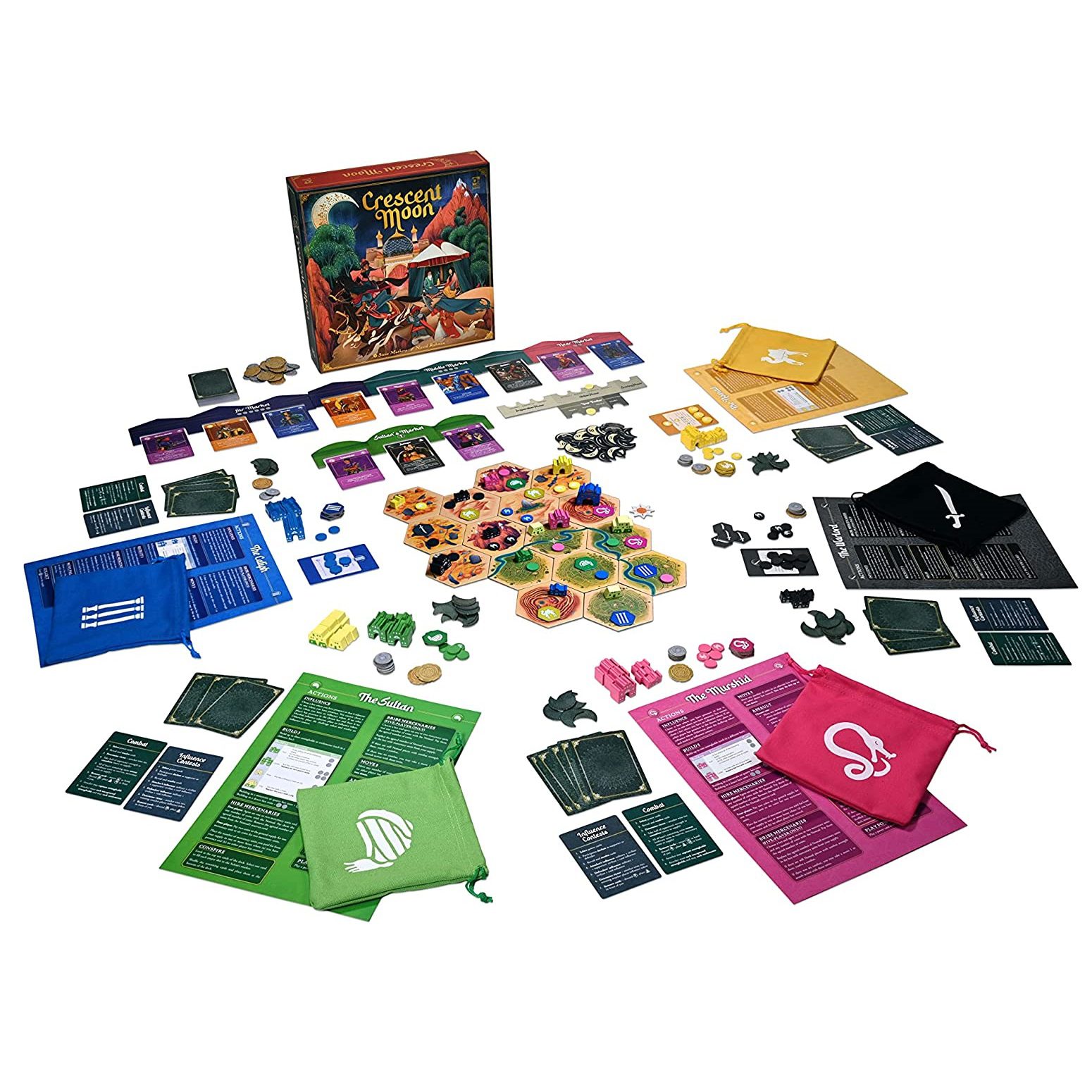 Crescent Moon is an area control game for four or five players. Take on the role of one of five radically asymmetric characters, each with their own objectives to fulfil, unique actions to utilise, and game-changing special powers to employ. Build symbiotic relationships with your allies, undermine your rivals, and choose your friends and enemies wisely in this cut-throat game of power and politics.