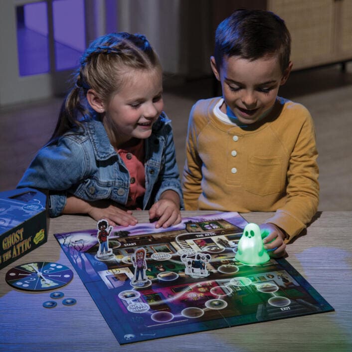 In Ghost in the Attic, players team up in the dark to outsmart a mischievous ghost! With a glow-in-the-dark game board and a light-up ghost mover, this cooperative board game brings spooky fun and family-friendly thrills to game night.