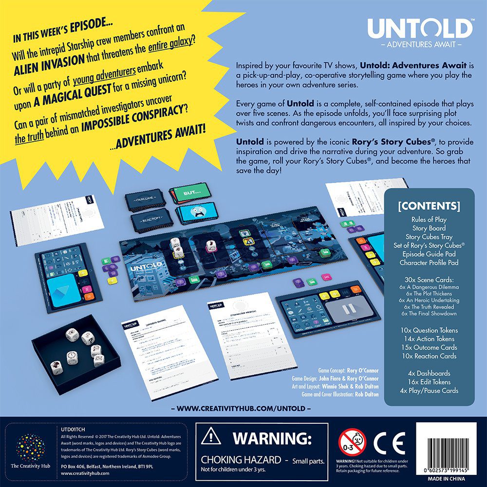 Untold: Adventures Await is the customizable storytelling game powered by Rory’s Story Cubes. Players become the heroes of a thrilling tale that unfolds in under 60 minutes. Think of Untold as your favorite TV series, except rather than just sitting back and watching, you’re right in the middle of the action!